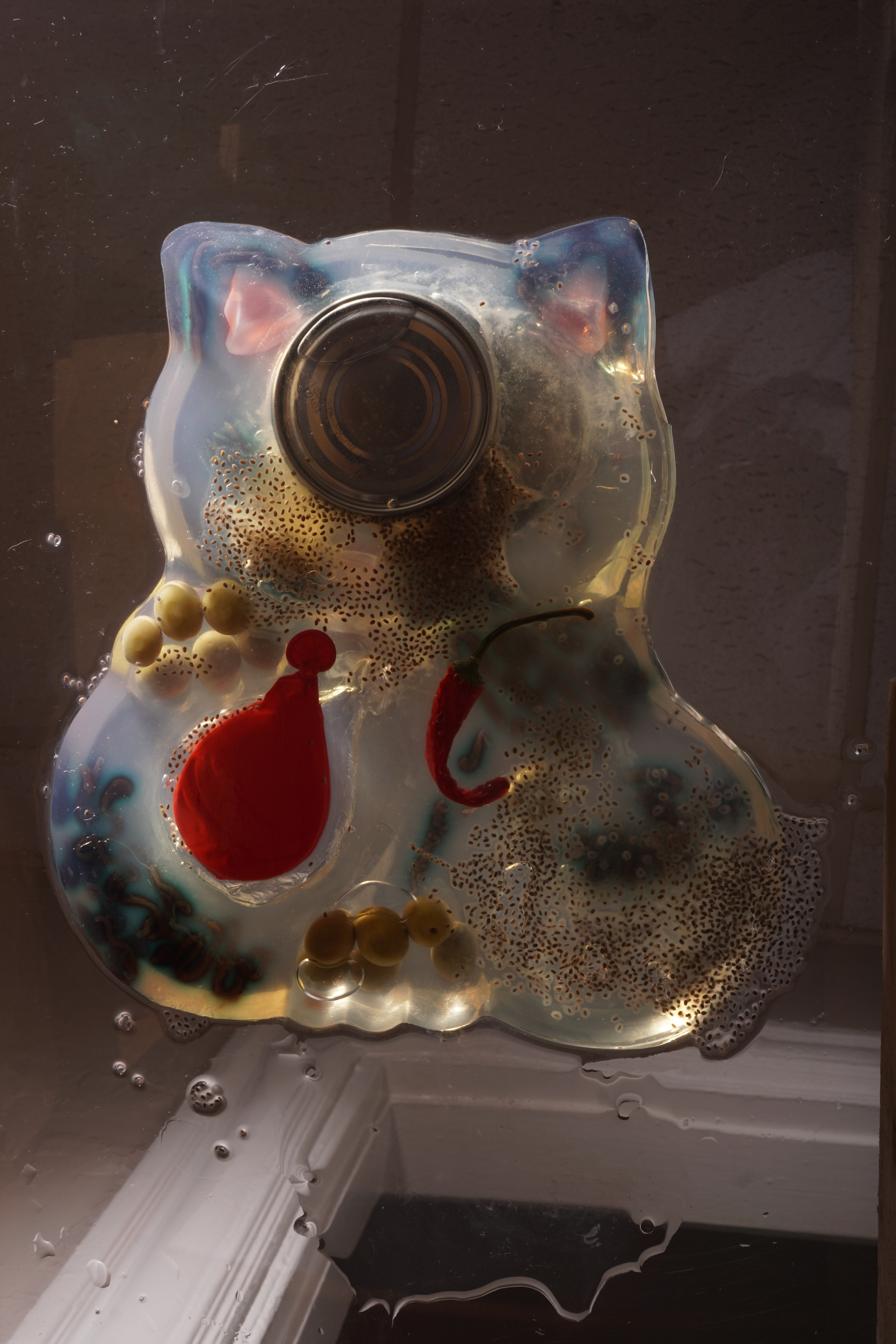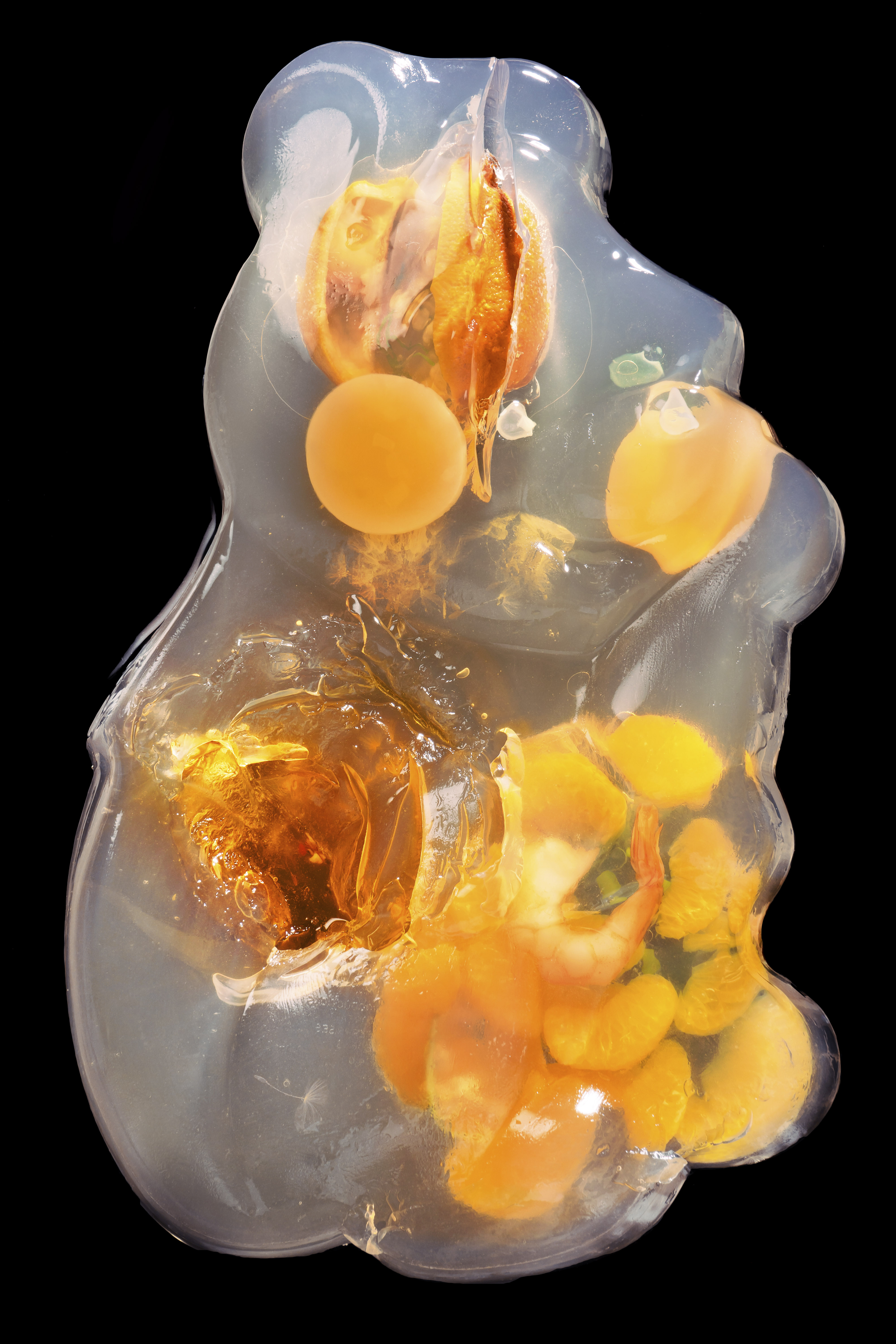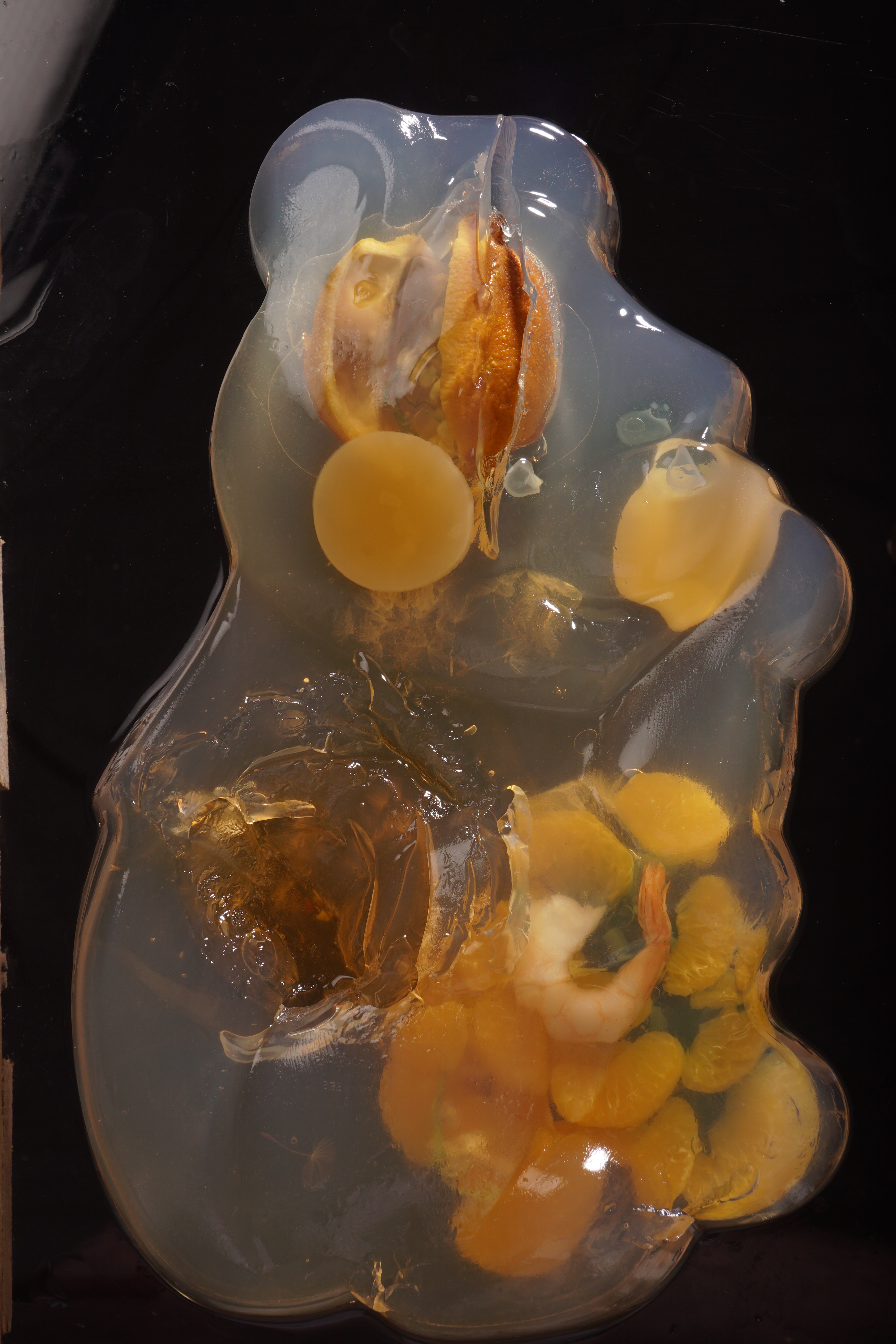 Below are some examples of retouching that I did on four photographs that I made of aspic-sculptures. Taking the photographs was very difficult due to COVID-19. I was shooting in my home without a tripod, so I was either standing on a chair in my kitchen to photograph these and limited by the ceiling or lying under the structure that I made to have a stable surface and get multiple angles. The structure was a palette that sat on two chairs, I had sawed boards from the palette to make a space which would be cleaner to photograph on.