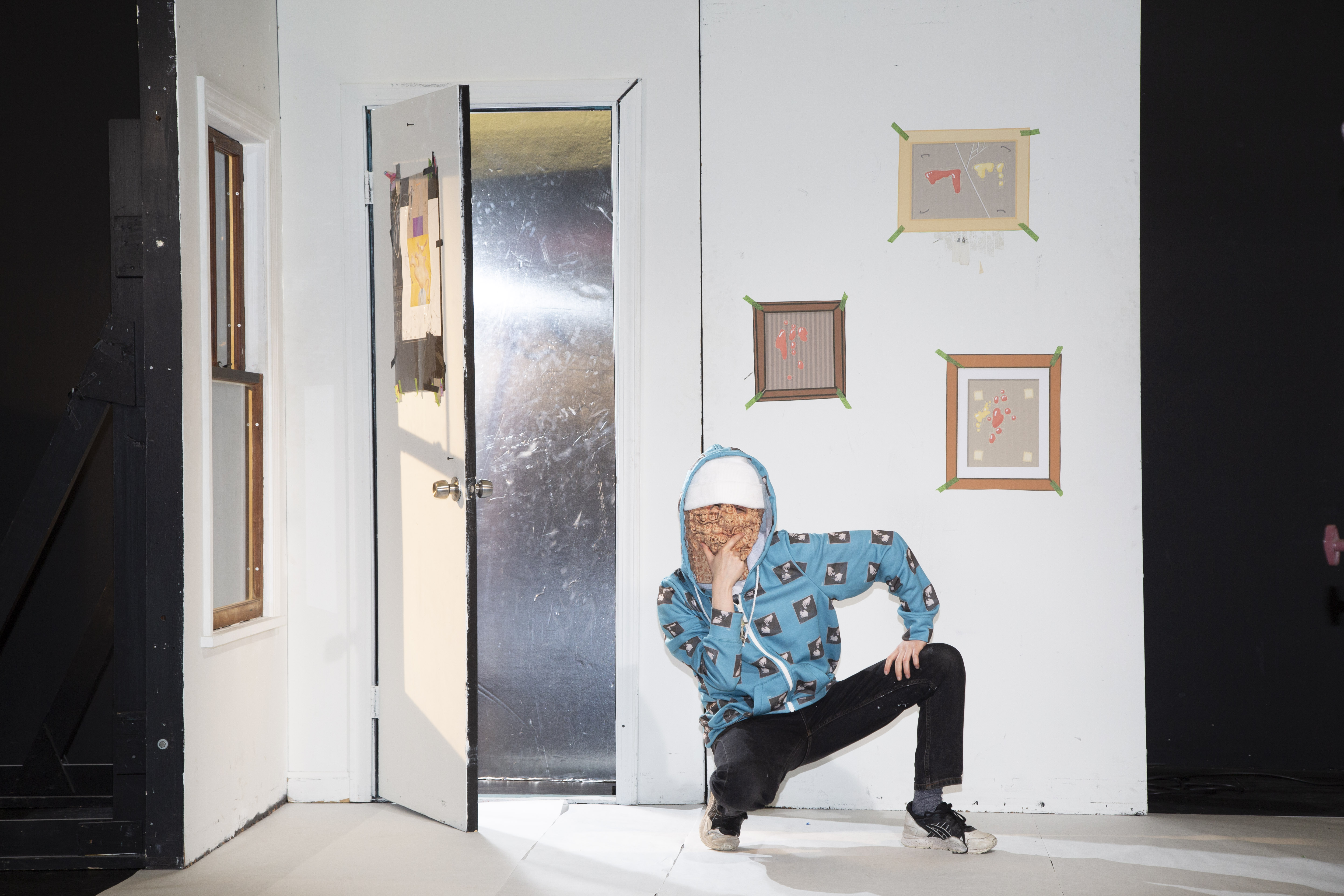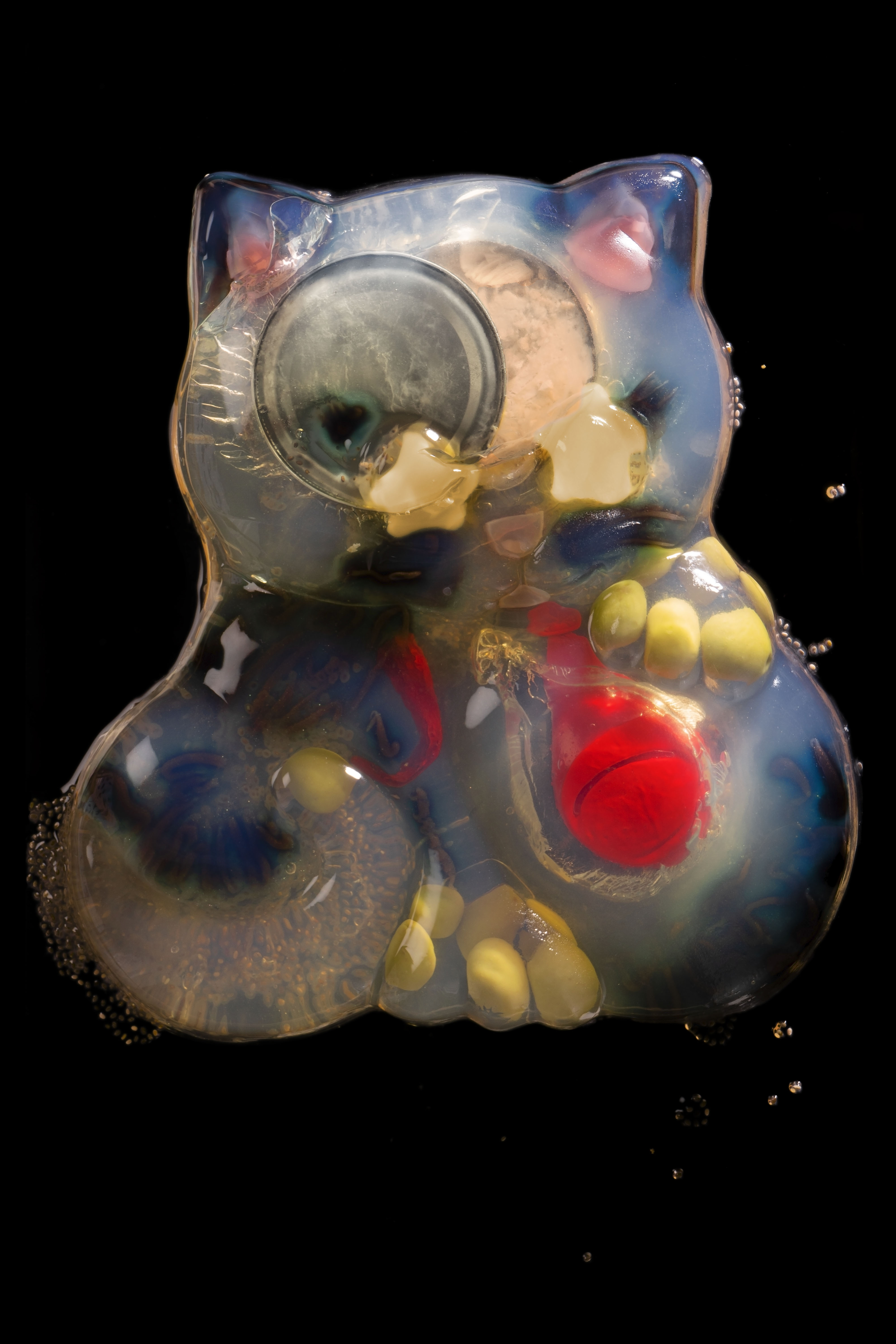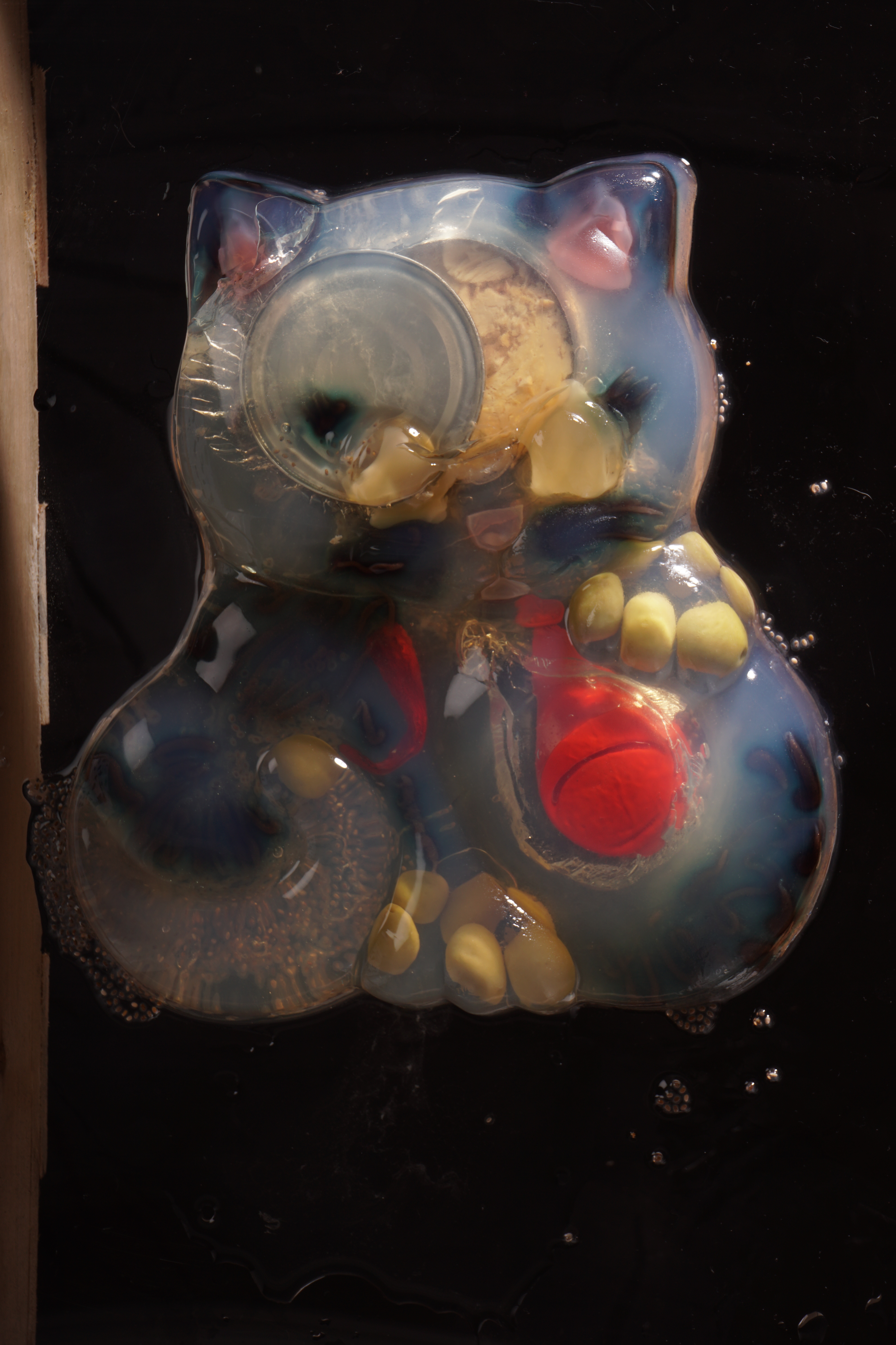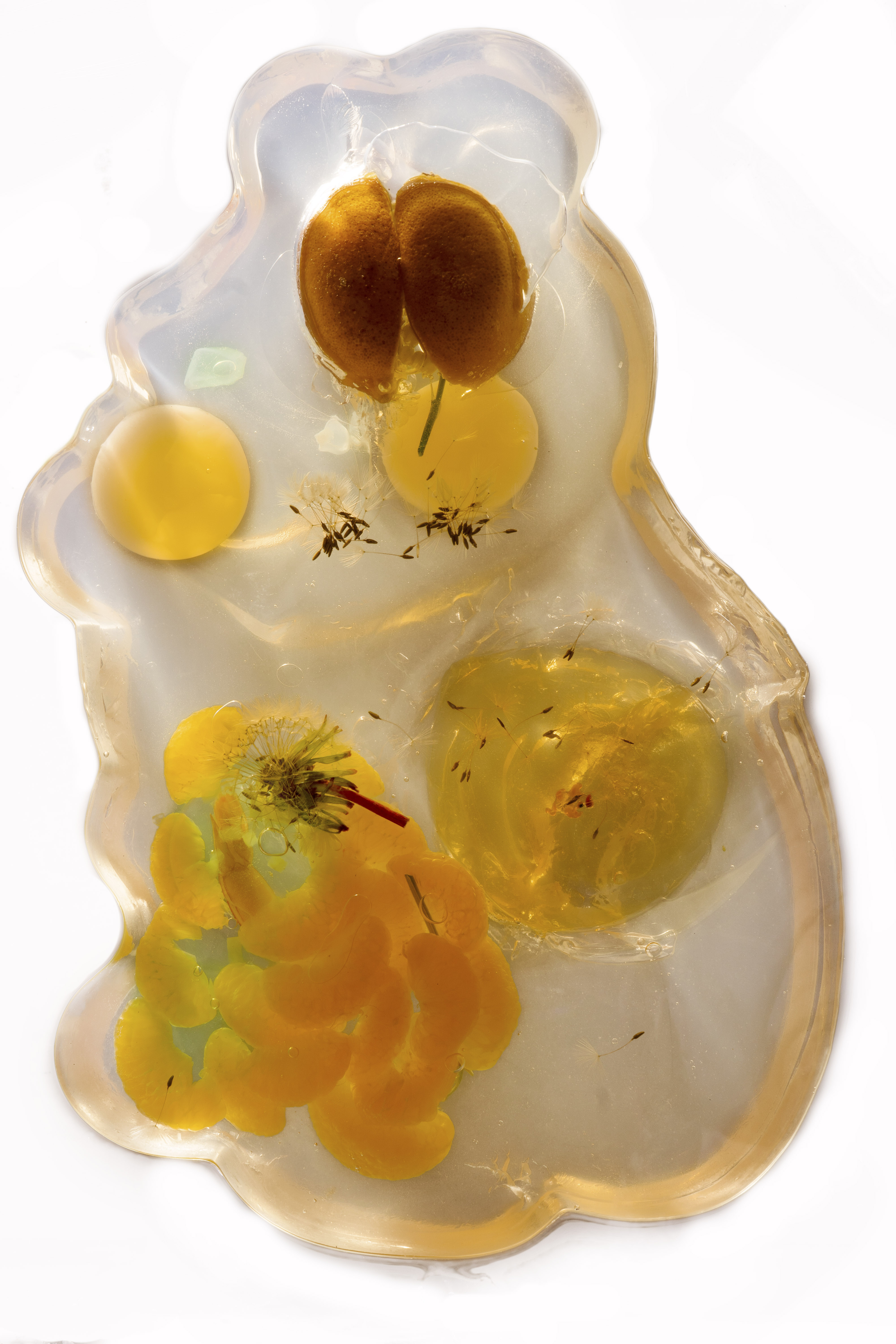 Below are some examples of retouching that I did on four photographs that I made of aspic-sculptures. Taking the photographs was very difficult due to COVID-19. I was shooting in my home without a tripod, so I was either standing on a chair in my kitchen to photograph these and limited by the ceiling or lying under the structure that I made to have a stable surface and get multiple angles. The structure was a palette that sat on two chairs, I had sawed boards from the palette to make a space which would be cleaner to photograph on.